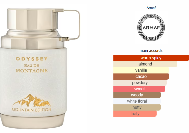 Odyssey Eau de Montagne by Armaf is a Oriental Vanilla fragrance for women and men. This is a new fragrance. Odyssey Eau de Montagne was launched in 2025. Top notes are Almond, Spices and Lactones; middle note is White Flowers; base notes are Vanilla, Cacao, Sandalwood and Musk.